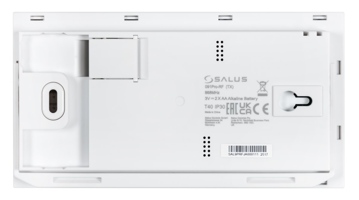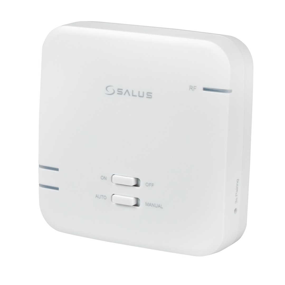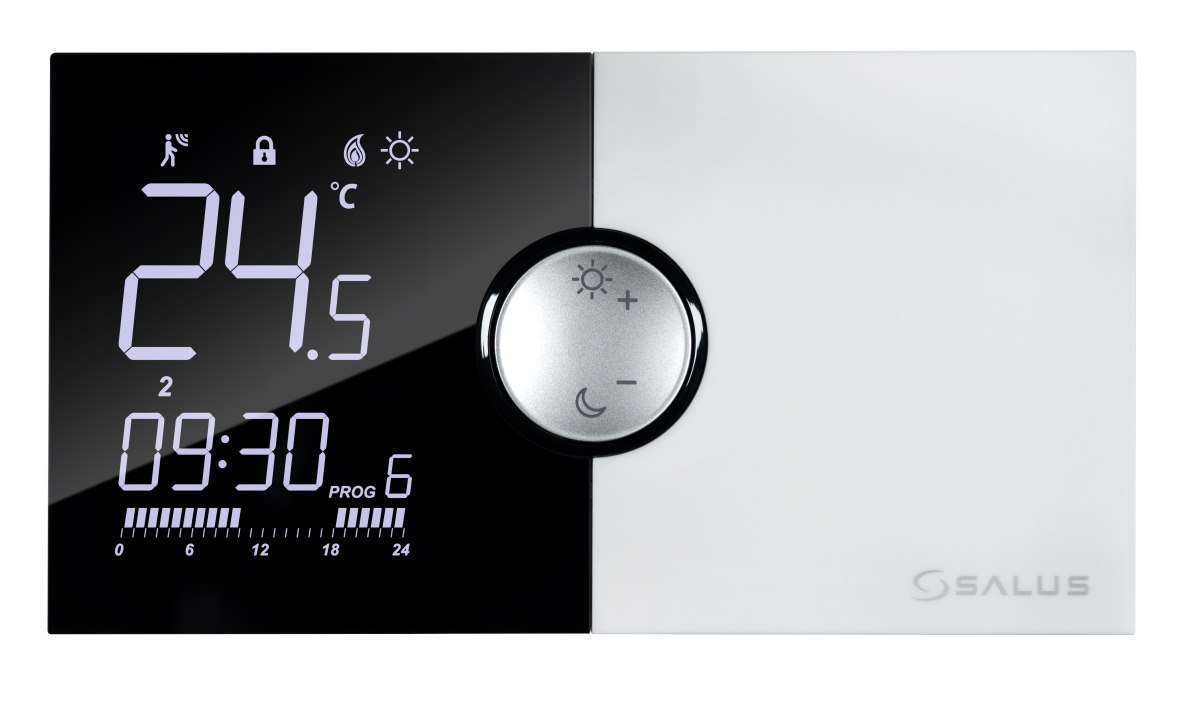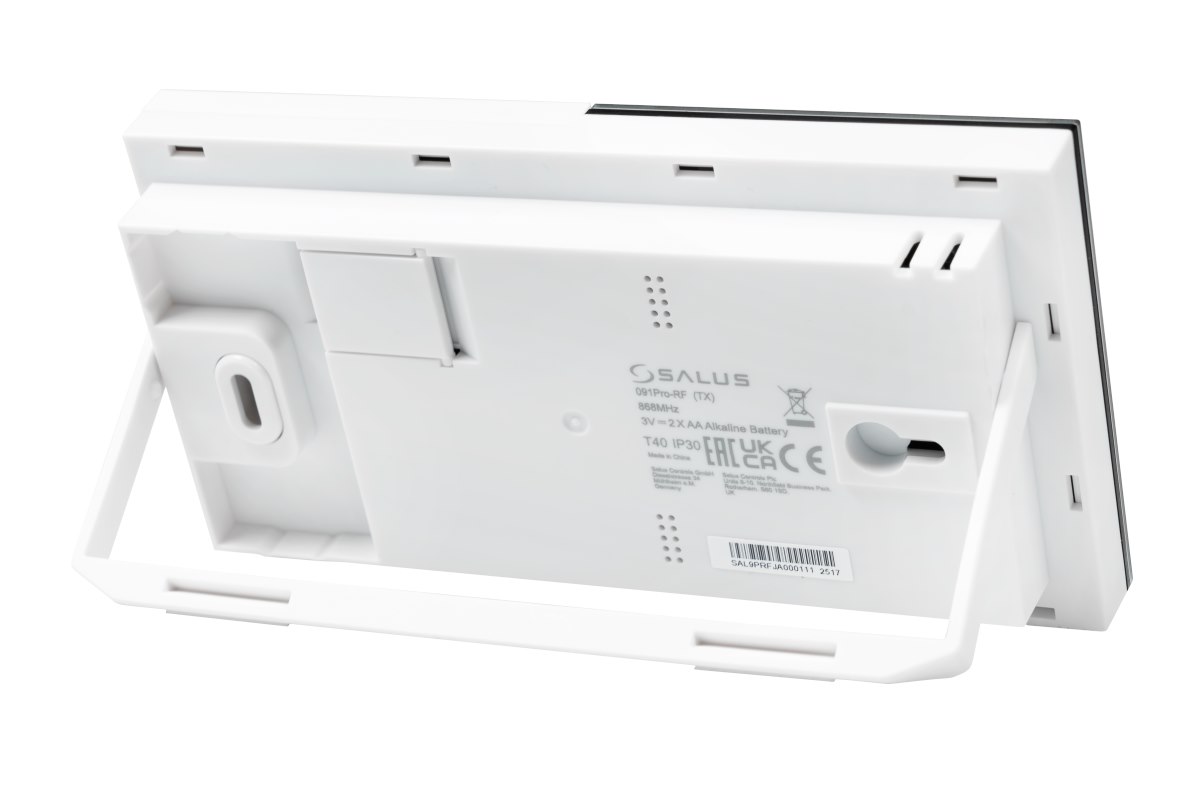 SALUS 091PRORF to nowoczesny, bezprzewodowy regulator temperatury przeznaczony do precyzyjnego sterowania urządzeniami grzewczymi lub chłodzącymi. Zestaw składa się z dwóch elementów: nadajnika montowanego w pomieszczeniu oraz odbiornika umieszczanego w pobliżu sterowanego urządzenia. Dzięki komunikacji radiowej w paśmie 868 MHz urządzenie umożliwia wygodne sterowanie bez konieczności prowadzenia przewodów instalacyjnych. Nadajnik zasilany jest bateryjnie (2x AA), natomiast odbiornik zasilany jest z sieci 230 V AC.