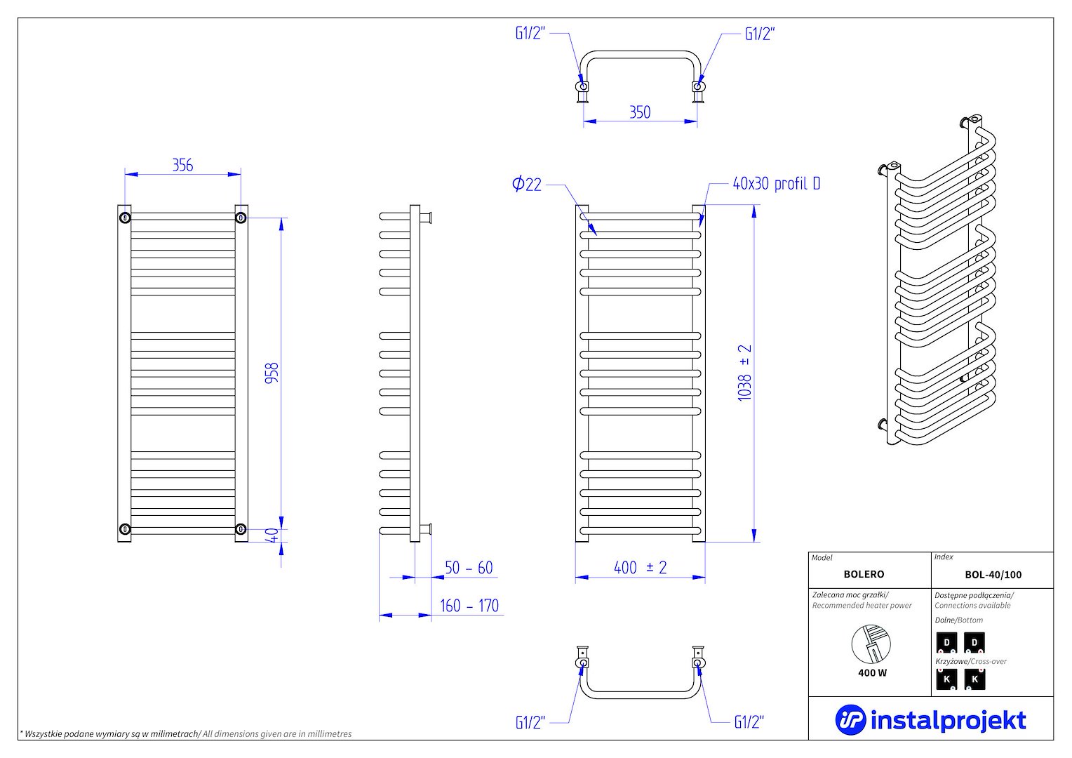 Grzejnik łazienkowy 400x1038 Bolero BOL-40/100