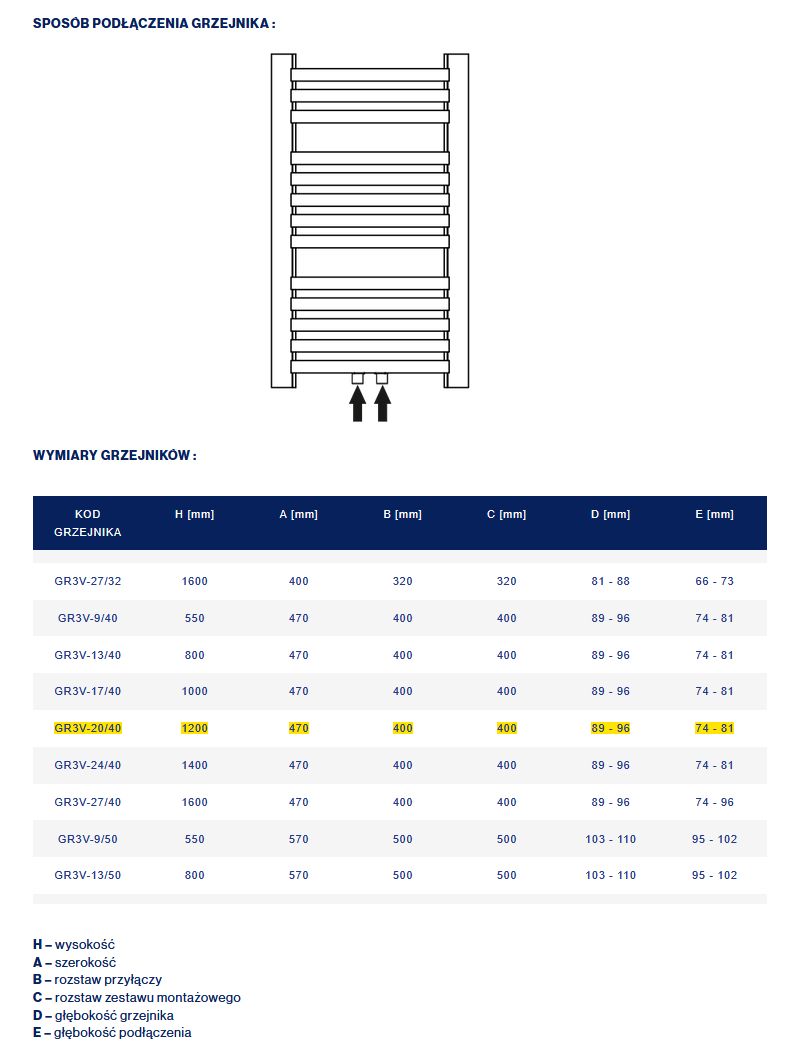 Grzejnik łazienkowy GR3V 470x1200 mm, 20 żeber, 485 W, zasilanie dolne V centryczne, kolor biały DIAMOND