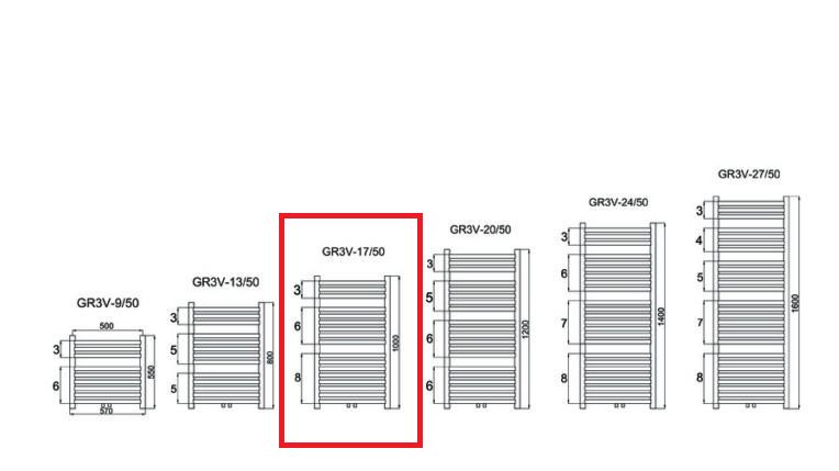Grzejnik łazienkowy GR3V 570x1000, 17-żeberek, 484 W, zasilanie dolne centryczne, czarny DIAMOND – GR3V-17/50.CZ