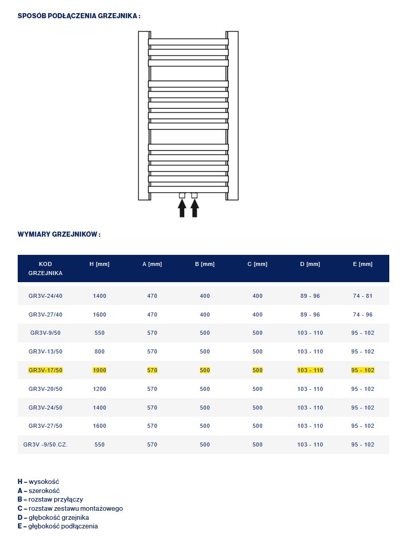Grzejnik przeznaczony jest do pracy w domowych instalacjach centralnego ogrzewania i wyposażony w dolne przyłącze centryczne (V), co ułatwia montaż i estetyczne podłączenie do systemu. Konstrukcja oparta na kolektorze o przekroju trójkątnym i poziomych szczeblach zapewnia równomierne rozprowadzanie ciepła oraz dużą powierzchnię grzewczą. Wersja o wymiarach 570x1000 mm i 17 elementach grzewczych generuje moc 484 W, co czyni ją odpowiednią do ogrzewania średniej wielkości łazienki.