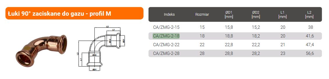 Złącza te są przystosowane do zaprasowywania za pomocą szczęk zaciskowych o profilu M, co umożliwia szybki i szczelny montaż bez potrzeby lutowania. Zastosowany o-ring z elastomeru HNBR (TEC H16GI-70) zapewnia niezawodną szczelność w zakresie temperatur od -20°C do +70°C. Produkt spełnia wszystkie aktualne normy techniczne, w tym PN-EN 437:2021-09 oraz wymogi Rozporządzenia Ministra Infrastruktury z dnia 12 kwietnia 2002 r.