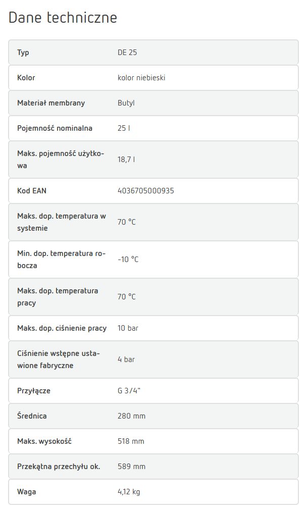 Naczynie posiada pojemność nominalną 25 litrów, ciśnienie robocze do 10 bar i temperaturę pracy do 70°C, co czyni je idealnym wyborem do szerokiej gamy zastosowań domowych i komercyjnych.