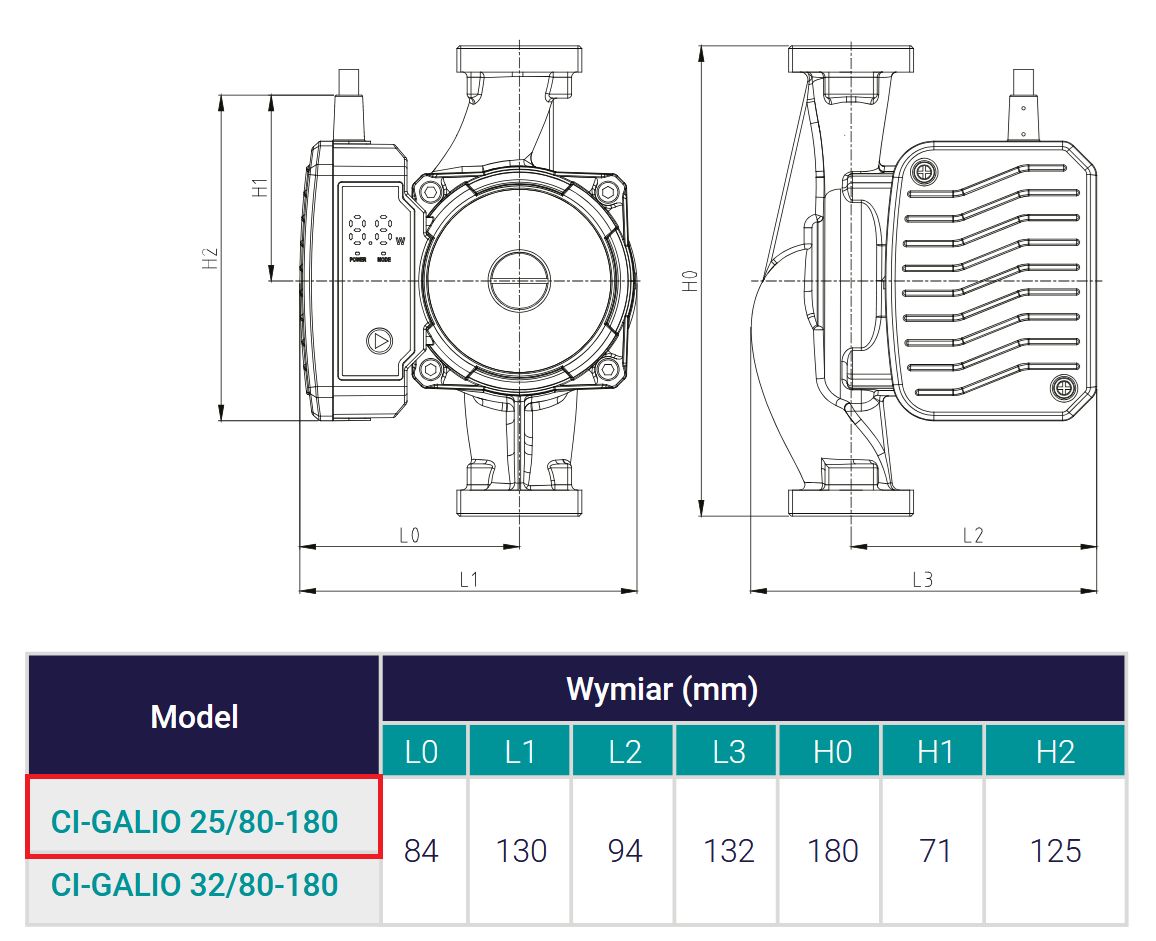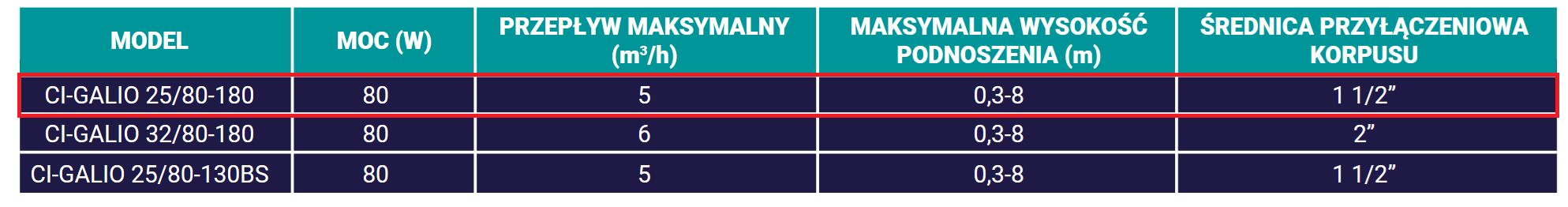 Model GALIO 25/80/180 cechuje się solidną konstrukcją z klasą ochrony IP44 oraz klasą izolacji F, co zapewnia trwałość i niezawodność nawet w trudniejszych warunkach pracy. Dzięki rozstawowi montażowemu 180 mm i średnicy przyłączy 25 mm, pompa pasuje do wielu standardowych instalacji.