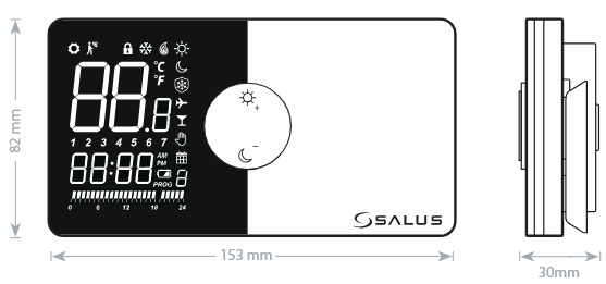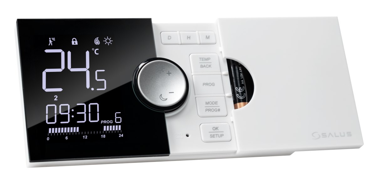 Regulator SALUS 091PRO to nowoczesne urządzenie przeznaczone do precyzyjnego sterowania systemami grzewczymi lub chłodzącymi w budynkach mieszkalnych i użytkowych. Dzięki przewodowemu połączeniu oraz zasilaniu bateryjnemu (2x AA), model ten oferuje elastyczność instalacji bez konieczności doprowadzania zasilania sieciowego. Urządzenie montowane jest natynkowo, bezpośrednio na ścianie, co ułatwia instalację i umożliwia szybki dostęp do panelu sterującego.