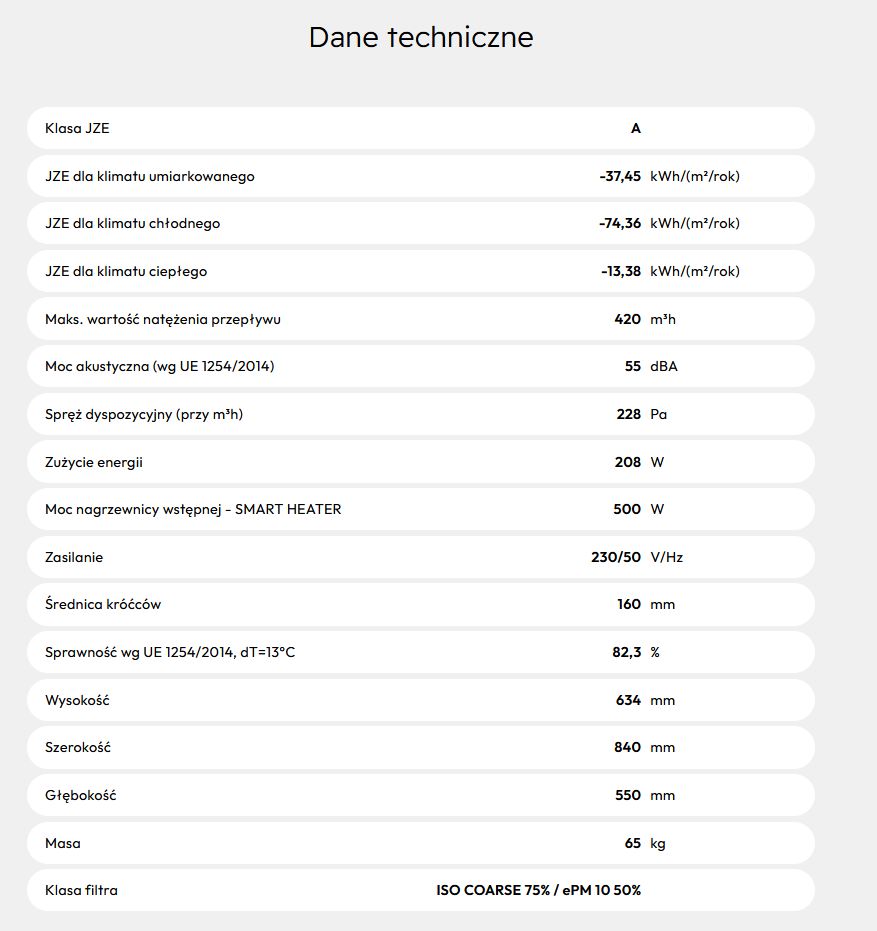 Kompaktowa konstrukcja z pionowym układem króćców ułatwia montaż w pomieszczeniach technicznych. Zastosowanie wentylatorów z silnikami EC pozwala na oszczędną i cichą pracę, a przeciwprądowy wymiennik ciepła zapewnia wysoki poziom odzysku energii cieplnej. Urządzenie wyposażono również w automatyczny bypass oraz zintegrowaną nagrzewnicę wstępną Smart Heater, co pozwala na stabilną pracę w niskich temperaturach.