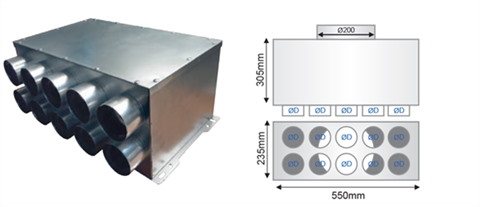 Rozdzielacz przelotowy dwurzędowy PRODMAX SK 10x75/200D to funkcjonalny element systemów wentylacyjnych, przeznaczony do rozprowadzania powietrza w instalacjach nawiewnych i wywiewnych. Dzięki swojej konstrukcji – dziesięciokróćcowej, rurowej oraz dwurzędowej – umożliwia efektywne rozdzielenie strumienia powietrza z jednego kanału głównego na kilka pomniejszych przewodów, co ułatwia równomierne wentylowanie całego budynku.