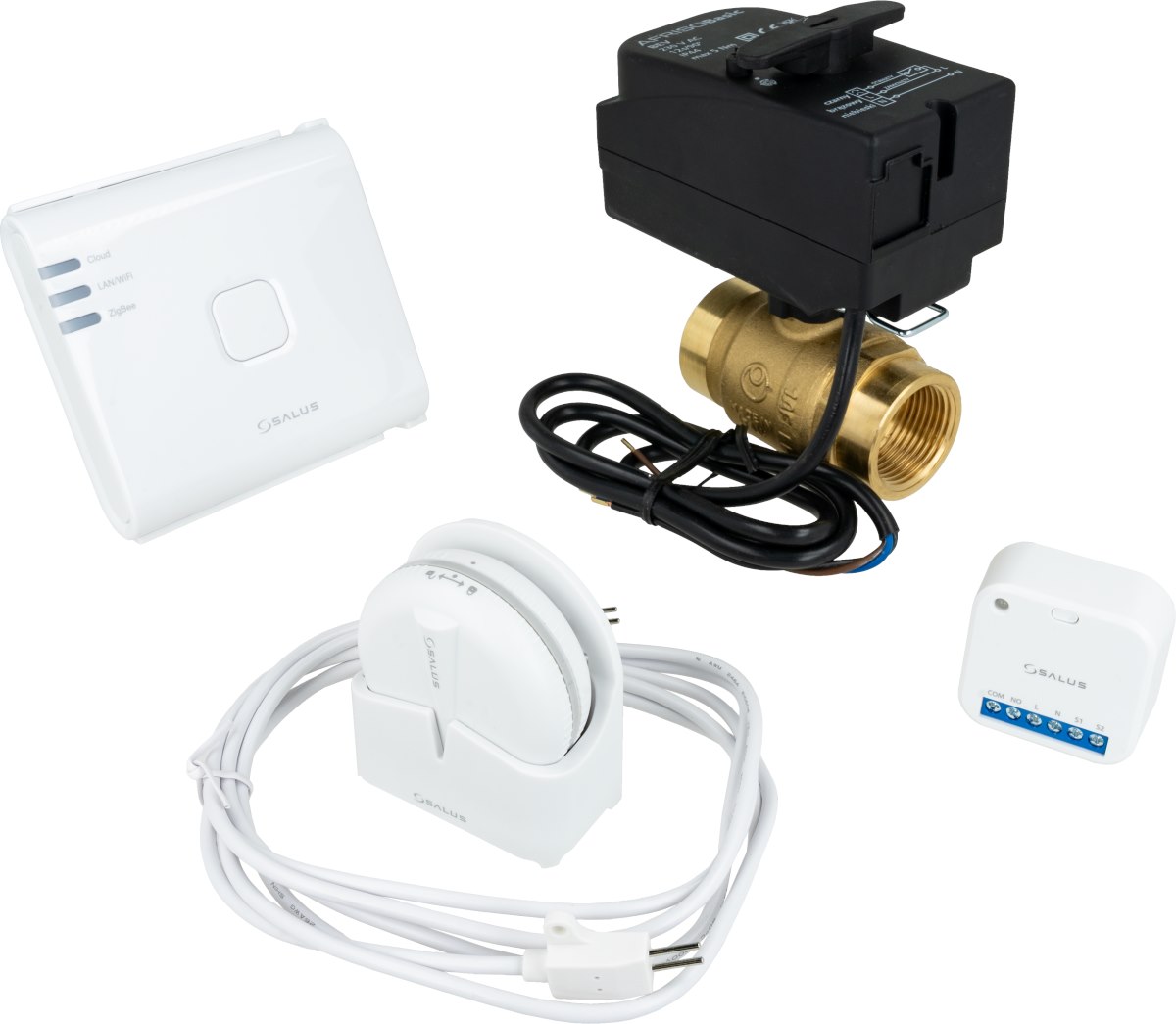 SALUS zestaw przeciwzalaniowy - system bezprzewodowej detekcji wycieku (bramka UG800 + przekaźnik SR600 + czujnik WLS600) z zaworem kulowym z siłownikiem BEV 213, DN25, Kvs 60 m3/h, Rp1"