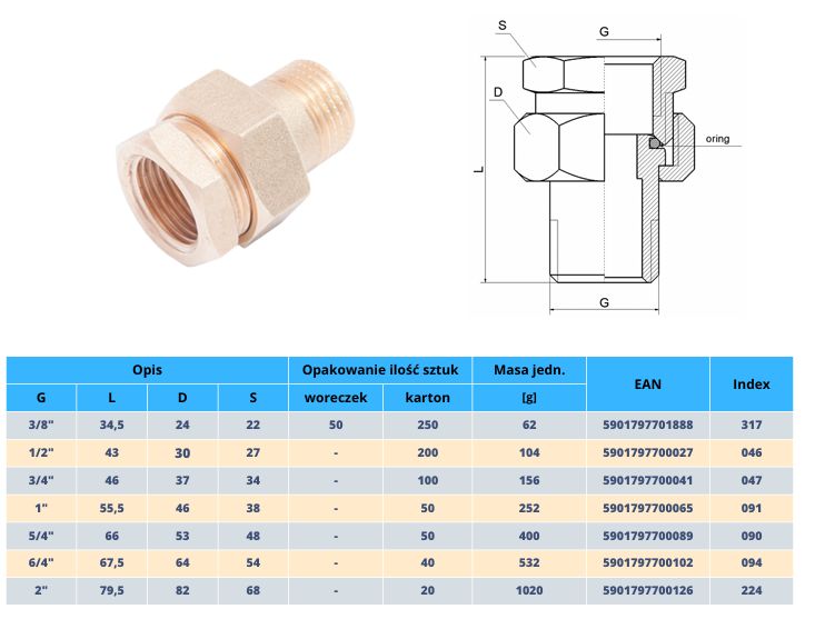 Strona główna » Ogrzewanie » Systemy instalacyjne » Złączki mosiężne » Śrubunki mosiężne ORING proste » Śrubunek mosiężny stożkowy 1 1/2 ( DN40 )