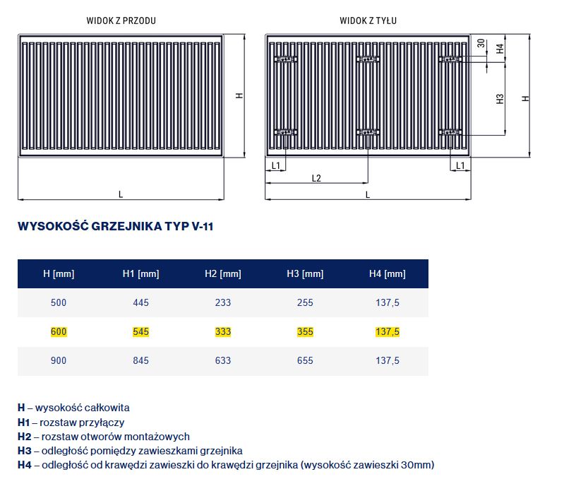 Stalowy Grzejnik Panelowy TYP-22 600x1800, Z. BOCZNE Z MOCOWANIEM