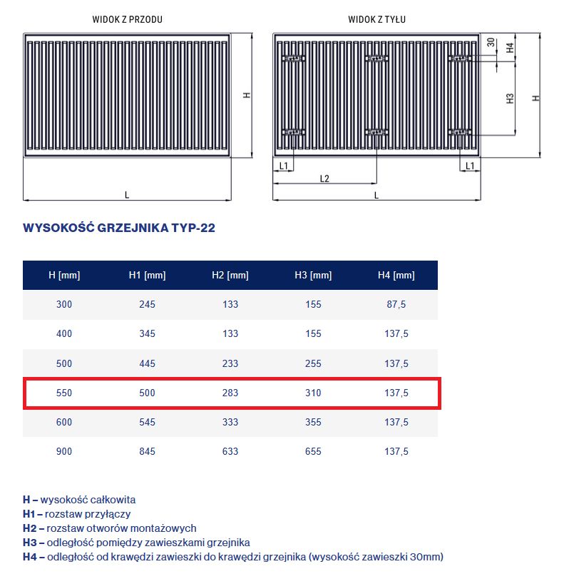 Stalowy Grzejnik Panelowy TYP-22 550x1200, Z. BOCZNE Z MOCOWANIEM DIAMOND