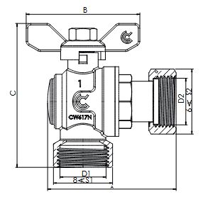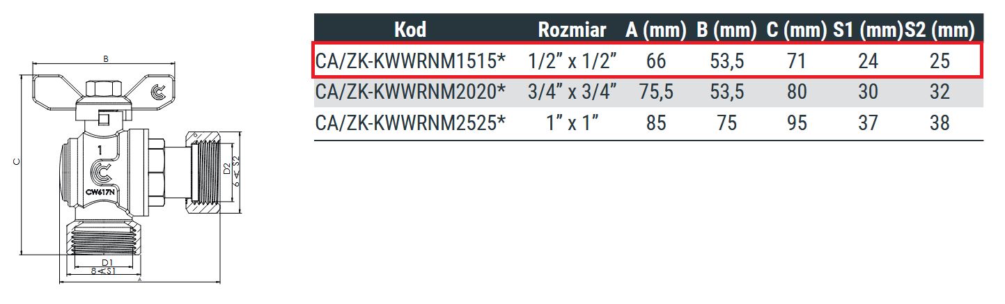 Zawór kulowy kątowy z ruchomą nakrętką W/W 1/2" (DN15) MOTYLEK PN30 – seria CALIDO S30