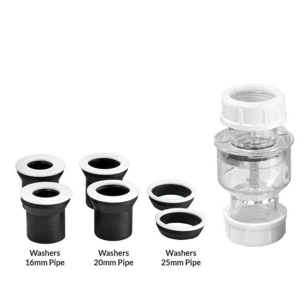 W zestawie znajdują się trzy warianty redukcji: 16 mm, 20 mm i 25 mm, co zapewnia elastyczność montażu w różnych typach instalacji. Mechanizm zaworu oparty jest na sprawdzonym systemie tłoczkowym, który otwiera przepływ przy ciśnieniu słupa wody o wysokości 15 mm, gwarantując płynne i bezpieczne działanie. Konstrukcja z wysokiej jakości tworzywa ABS wykazuje dużą odporność na działanie wilgoci i wysokich temperatur, co czyni zawór trwałym i niezawodnym rozwiązaniem na długie lata.